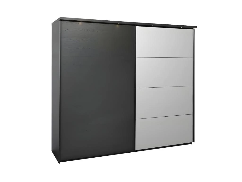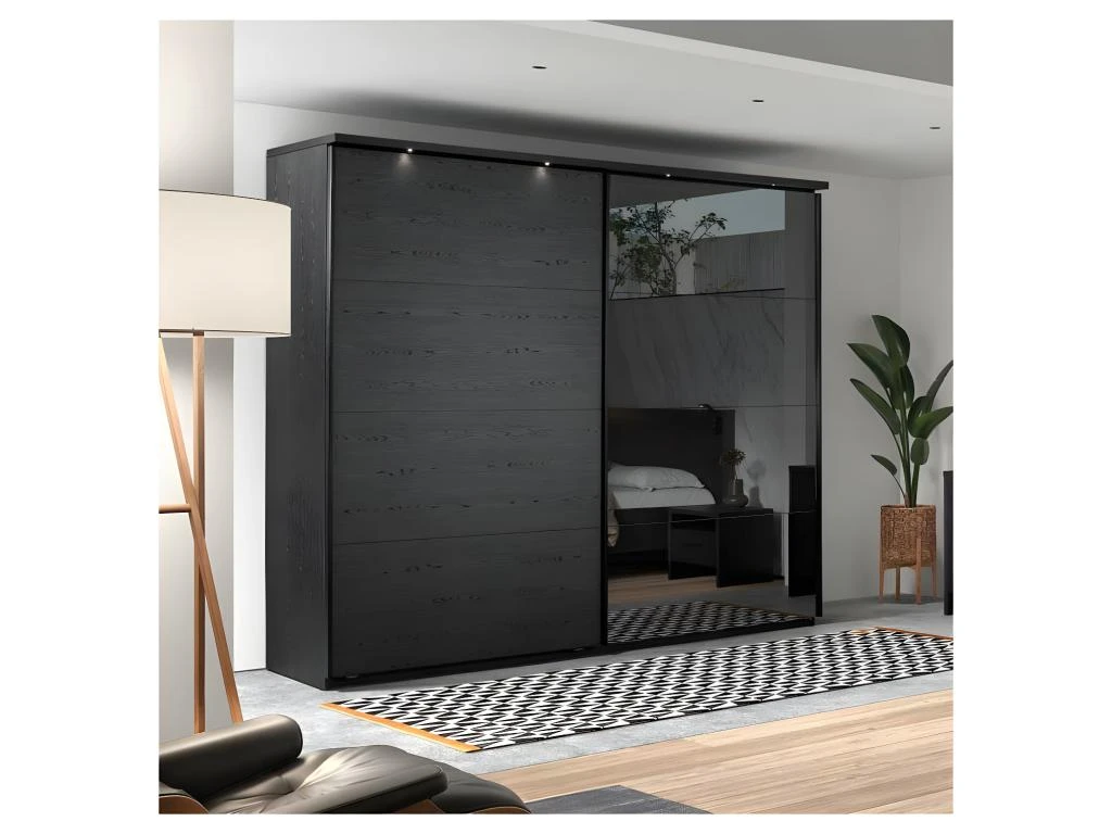 Mariant un corpus et une porte finition bois noir au rendu plus vrai que nature cette majestueuse armoire 2 portes coulissantes s’intègrera Ă tous les code couleurs, elle apportera en outre de la profondeur Ă votre chambre grâce Ă sa porte miroir.