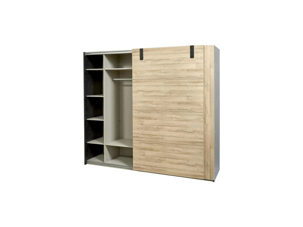 Armoire aménagée à la logeabilité exeptionnelle et la taille très confortable, portes coulissantes ne nécessitent aucun dégagement pour être ouvertes pour une solution gain de place efficace.