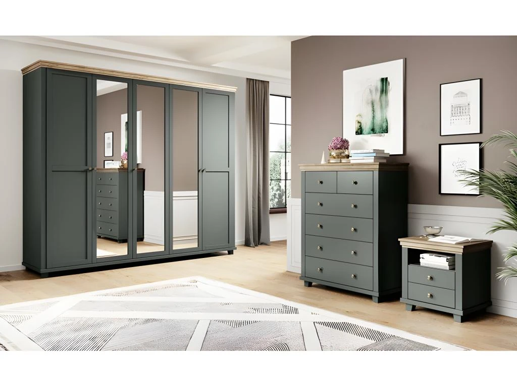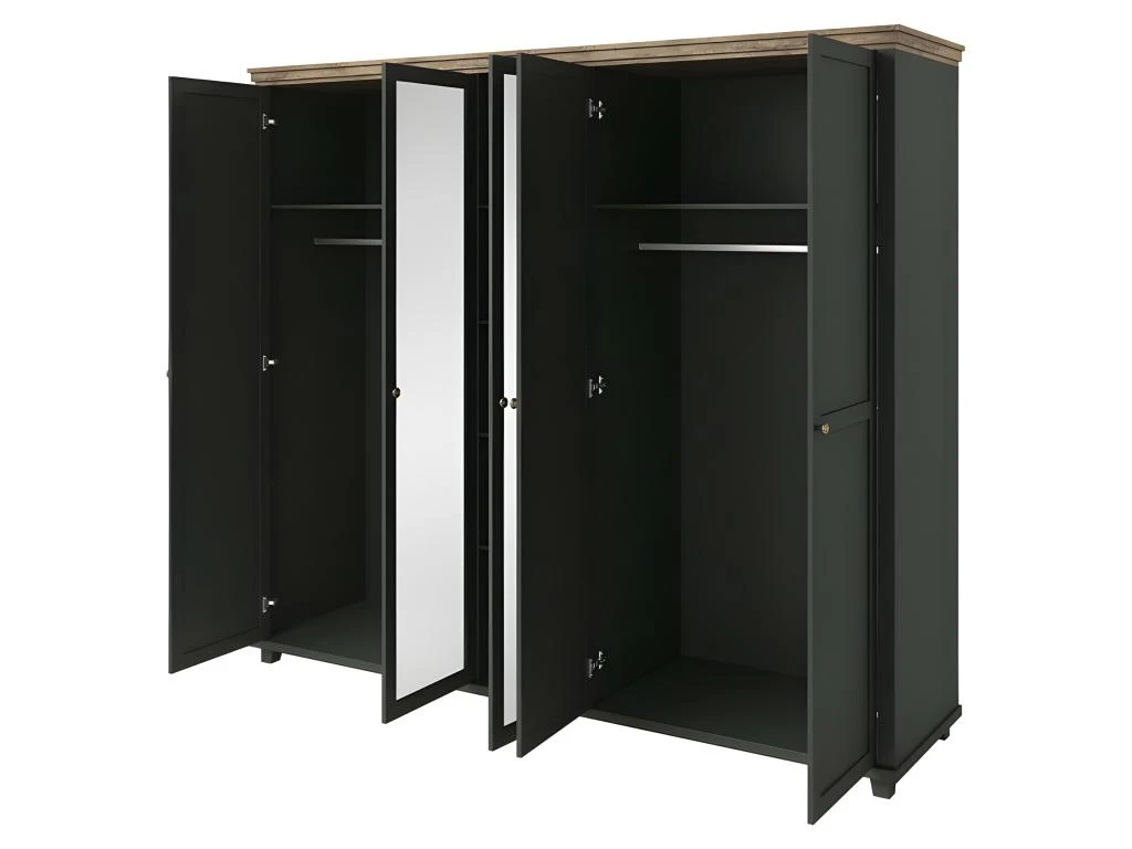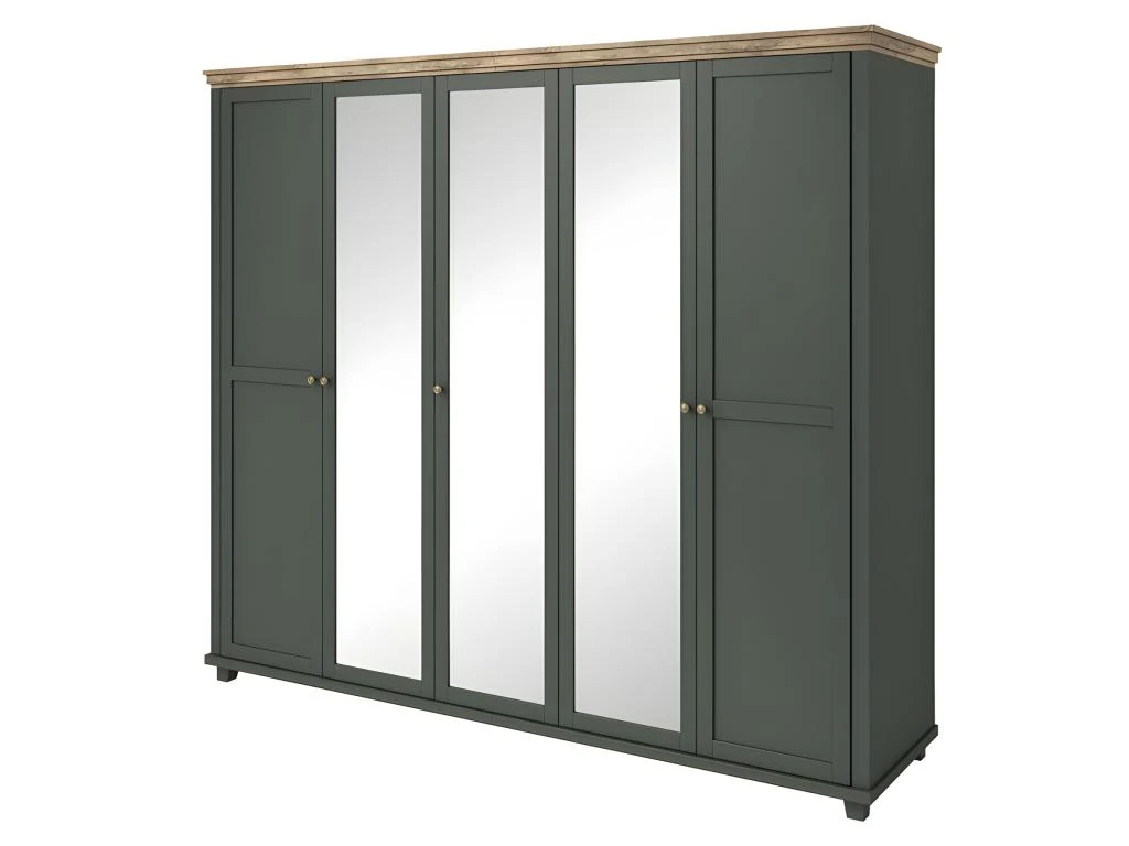 Armoire avec cinq portes dont trois avec un grand miroir. Cette garde robe vous charmera grùce à ses couleurs tendances et ses finitions soignées.