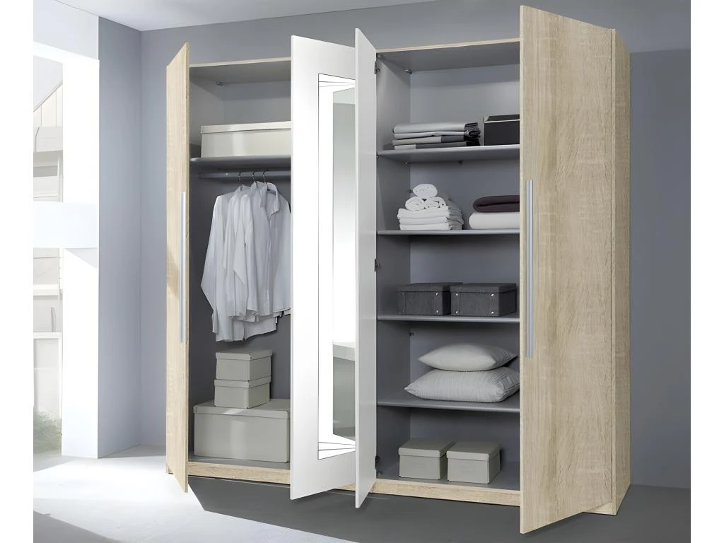 Cette garde robe sublimera votre chambre avec son coloris chĂȘne sonoma et blanc. ComposĂ©e de 4 portes dont 2 avec miroirs. Les 2 grands miroirs intĂ©grĂ©s seront parfaits pour vos sĂ©ances d’essayage et apporteront clartĂ© et luminositĂ© Ă votre chambre. L’intĂ©rieur est muni de nombreux espaces de rangements : 1 grande penderie et 6 Ă©tagĂšres afin d’en faire un dressing qui accueillera aisĂ©ment toute votre garde-robe.