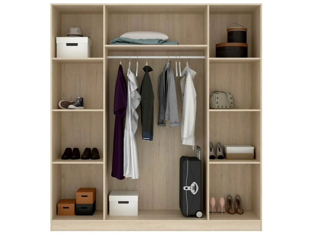 STRUCTURE ET UTILISATION – Armoire Ă quatre portes battantes, composĂ©e d’une zone centrale avec deux portes, d’une tringle Ă vĂȘtements et d’une Ă©tagĂšre et de deux zones latĂ©rales avec quatre Ă©tagĂšres de chaque cĂŽtĂ© – GrĂące Ă l’organisation interne de ses espaces, elle offre un grand espace de rangement – Toute la structure du meuble est parfaite pour meubler une chambre double, une chambre d’enfants ou une chambre d’amis de maniĂšre peu encombrante – Les Ă©tagĂšres internes combinĂ©es Ă la tringle Ă vĂȘtements vous permettront de ranger vos vĂȘtements et robes de maniĂšre ordonnĂ©e.