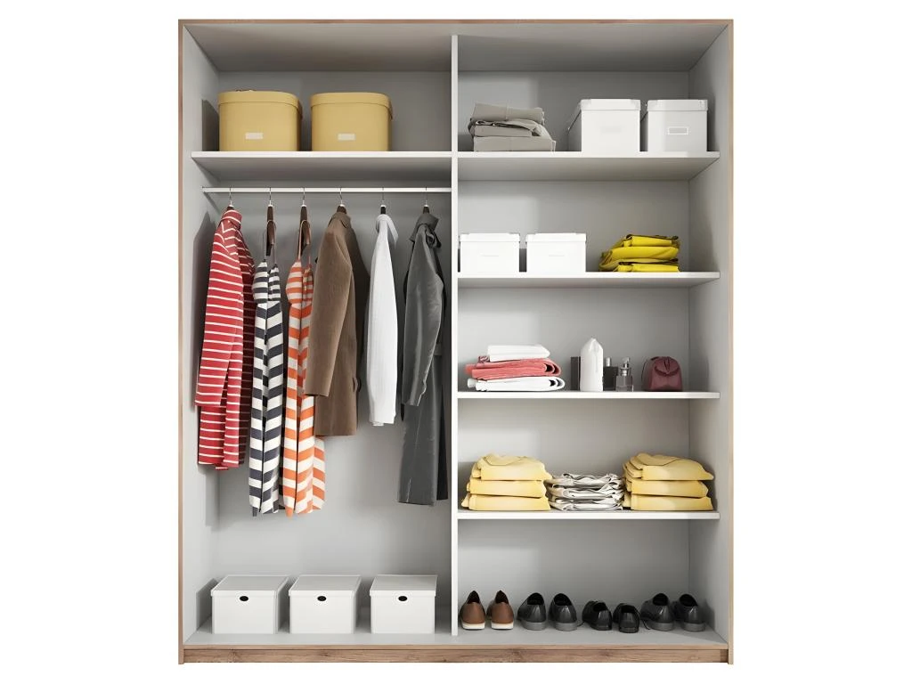 Cette garde robe sublimera votre chambre avec son coloris chĂȘne clair et blanc. ComposĂ©e de 2 portes avec un miroir. central. Ce grand miroir sera parfait pour vos sĂ©ances d’essayage et apporteront clartĂ© et luminositĂ© Ă votre chambre. L’intĂ©rieur est muni de nombreux espaces de rangements : une grandes penderies et 5 Ă©tagĂšres afin d’en faire un dressing qui accueillera aisĂ©ment toute votre garde-robe.