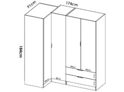 STRUCTURE ET UTILISATION – Armoire d’angle complète avec sept compartiments, deux grands tiroirs et trois barres de cintre, toutes à l’intérieur de portes battantes pratiques – Grâce à l’organisation interne de ses espaces, elle offre un grand espace de rangement – Toute la structure de l’armoire est parfaite pour meubler une chambre double, une chambre d’enfants ou une chambre d’amis de manière peu encombrante – Les étagères intérieures combinées à la tringle à vêtements vous permettront de ranger les vêtements et les robes de manière ordonnée.