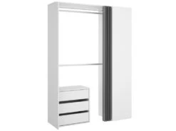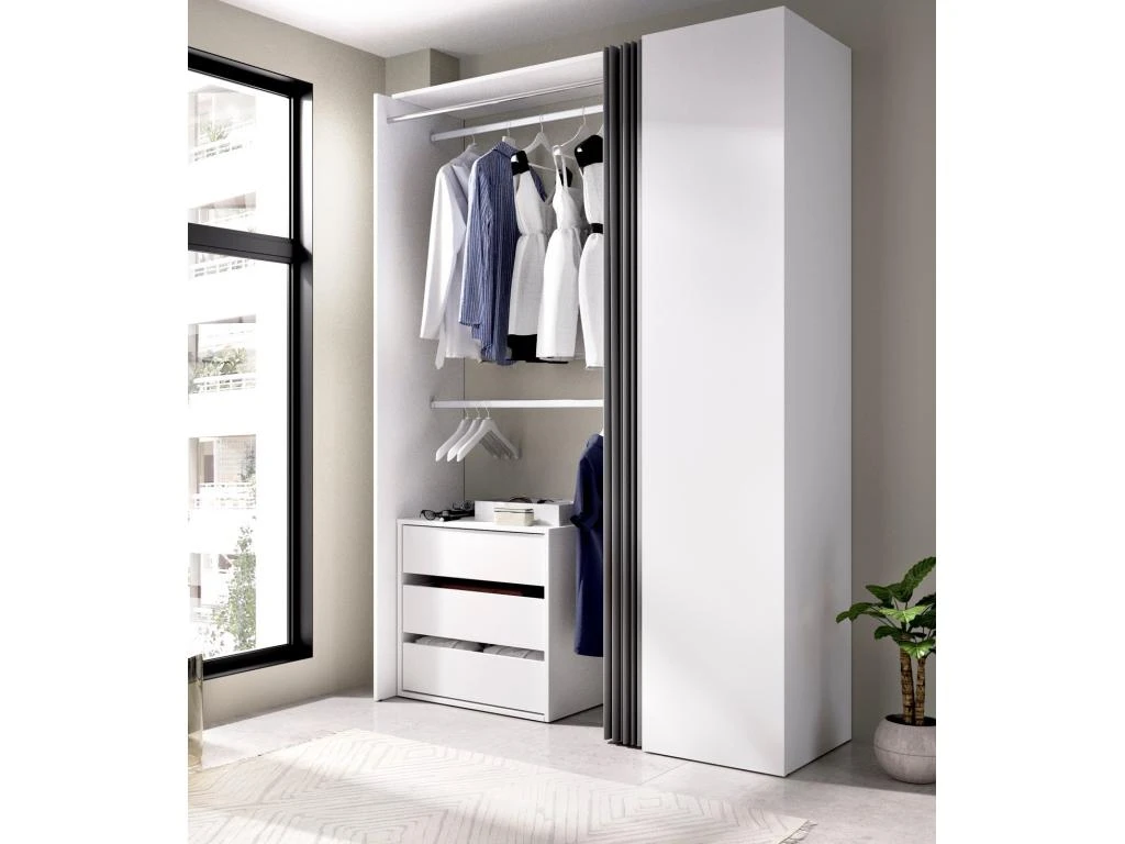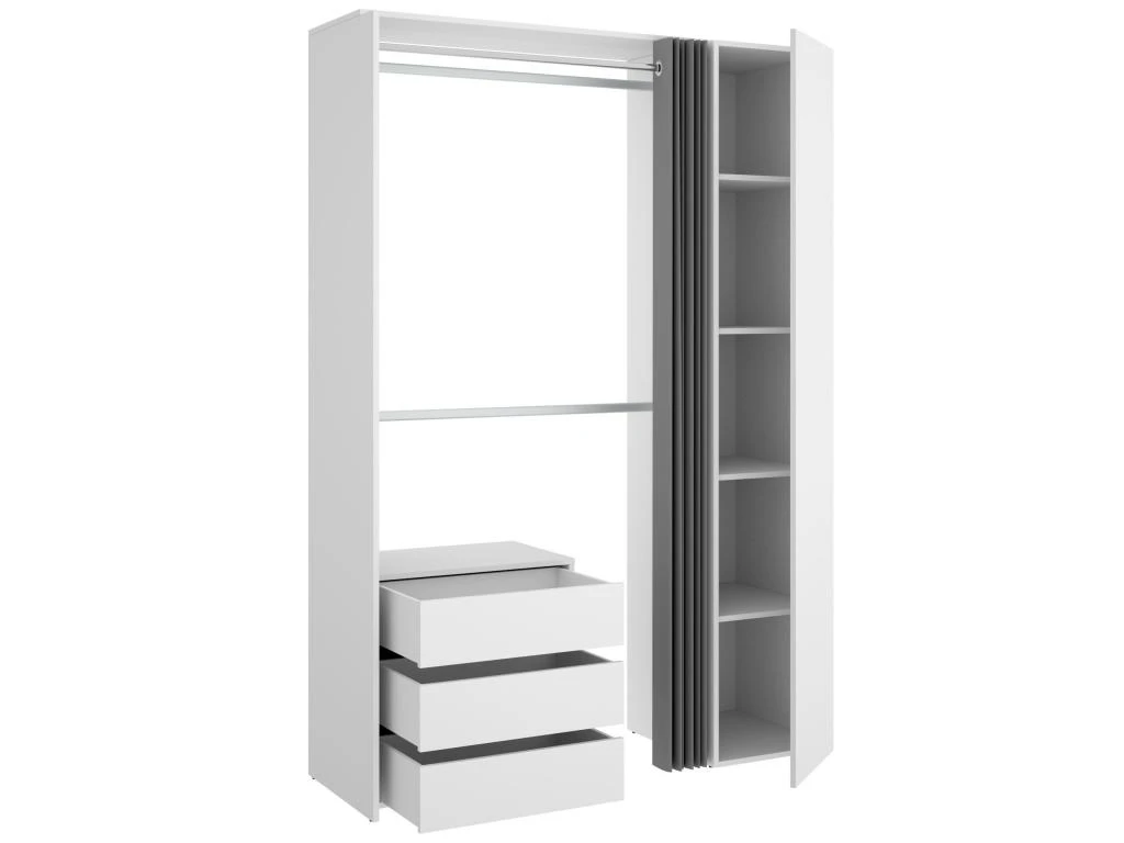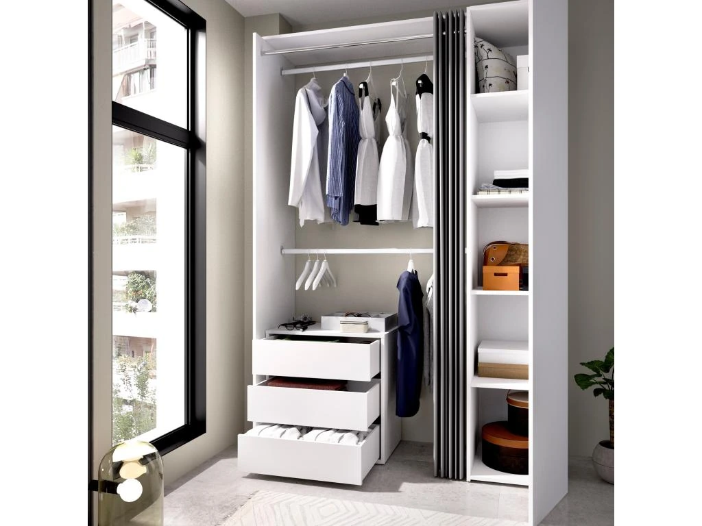 STRUCTURE ET UTILISATION – Armoire Ă rideau complĂšte avec une armoire Ă colonnes avec porte battante et cinq compartiments internes, une commode avec trois grands tiroirs et deux tringles Ă vĂȘtements – GrĂące Ă l’organisation interne de ses espaces, elle offre un grand espace de rangement – L’ensemble du meuble la structure est parfaite pour meubler une chambre double, une chambre d’enfants ou une chambre d’amis de maniĂšre peu encombrante – Les Ă©tagĂšres internes combinĂ©es Ă la tringle Ă vĂȘtements vous permettront de ranger les vĂȘtements et les robes de maniĂšre ordonnĂ©e.