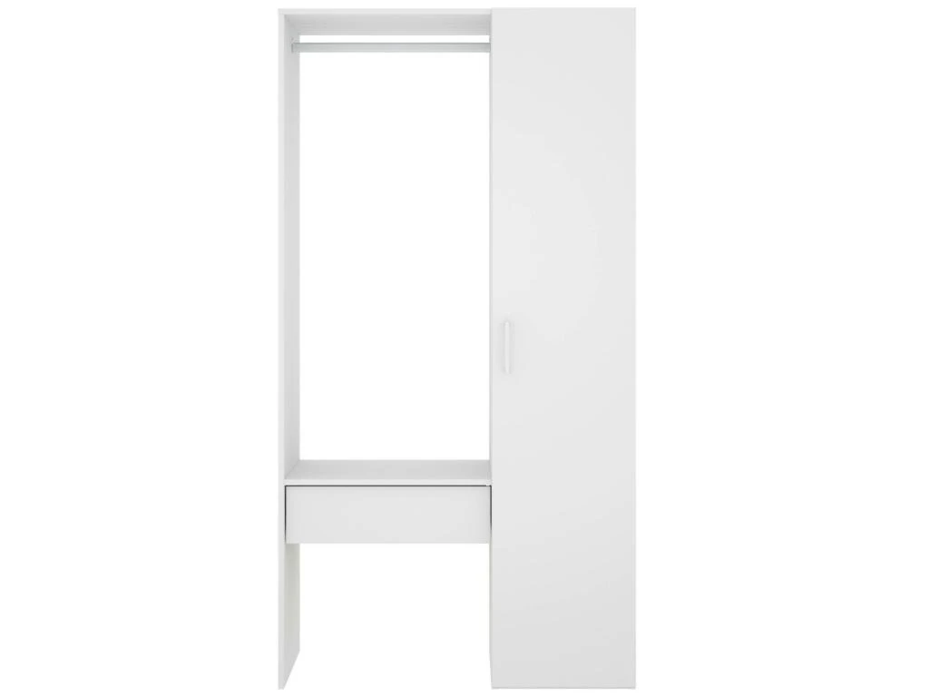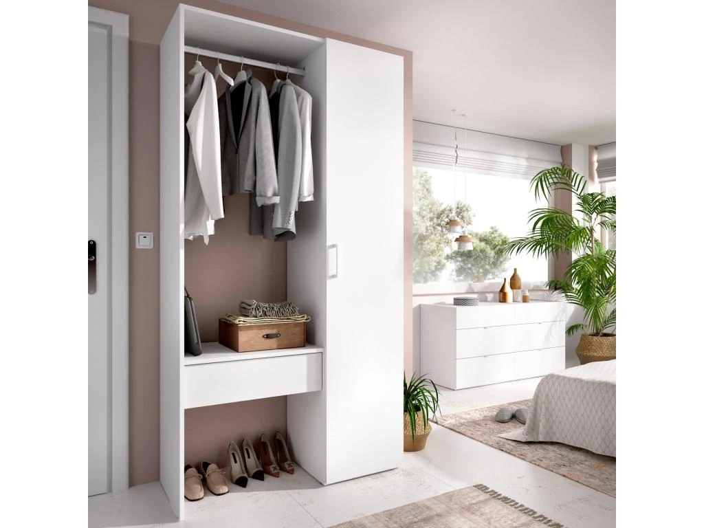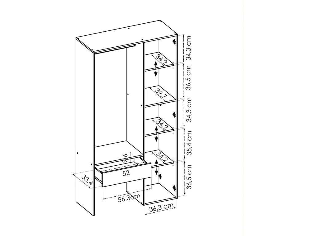 STRUCTURE ET UTILISATION – Armoire composĂ©e d’une colonne latĂ©rale Ă cinq compartiments, d’un tiroir central, d’une Ă©tagĂšre et d’une tringle Ă vĂȘtements – GrĂące Ă l’organisation interne de ses espaces, elle offre un vaste espace de rangement – Toute la structure du meuble est parfaite pour amĂ©nager une chambre double, une chambre d’enfants ou une chambre d’amis de maniĂšre peu encombrante – Les Ă©tagĂšres intĂ©rieures combinĂ©es Ă la tringle Ă vĂȘtements vous permettront de ranger les vĂȘtements et les robes de maniĂšre ordonnĂ©e.