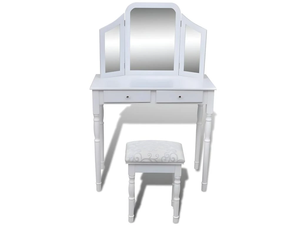 Cet ensemble de coiffeuse et de tabouret est fait de bois de pin de haute qualité.