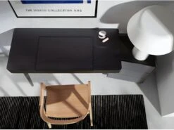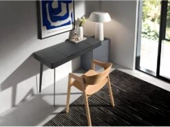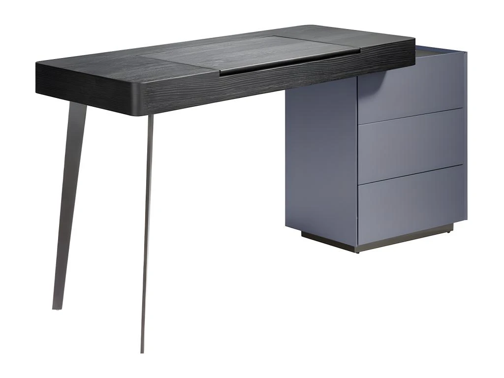 Coiffeuse au design moderne, fabriquĂ©e en bois de wengĂ© de couleur noire et dotĂ©e d’une structure originale avec des pieds en acier inoxydable noir. GrĂące Ă son bloc de tiroirs latĂ©raux en bois MDF laquĂ© bleu avec trois tiroirs Ă fermeture progressive et miroir rabattable avec plateau amovible, cette coiffeuse est idĂ©ale pour profiter de maniĂšre dĂ©tendue et tranquille de votre temps de soin personnel. GrĂące Ă son design avec un miroir rabattable dissimulĂ©, cette coiffeuse peut Ă©galement avoir une double fonction en tant que bureau ou table de travail dans votre chambre Ă coucher.