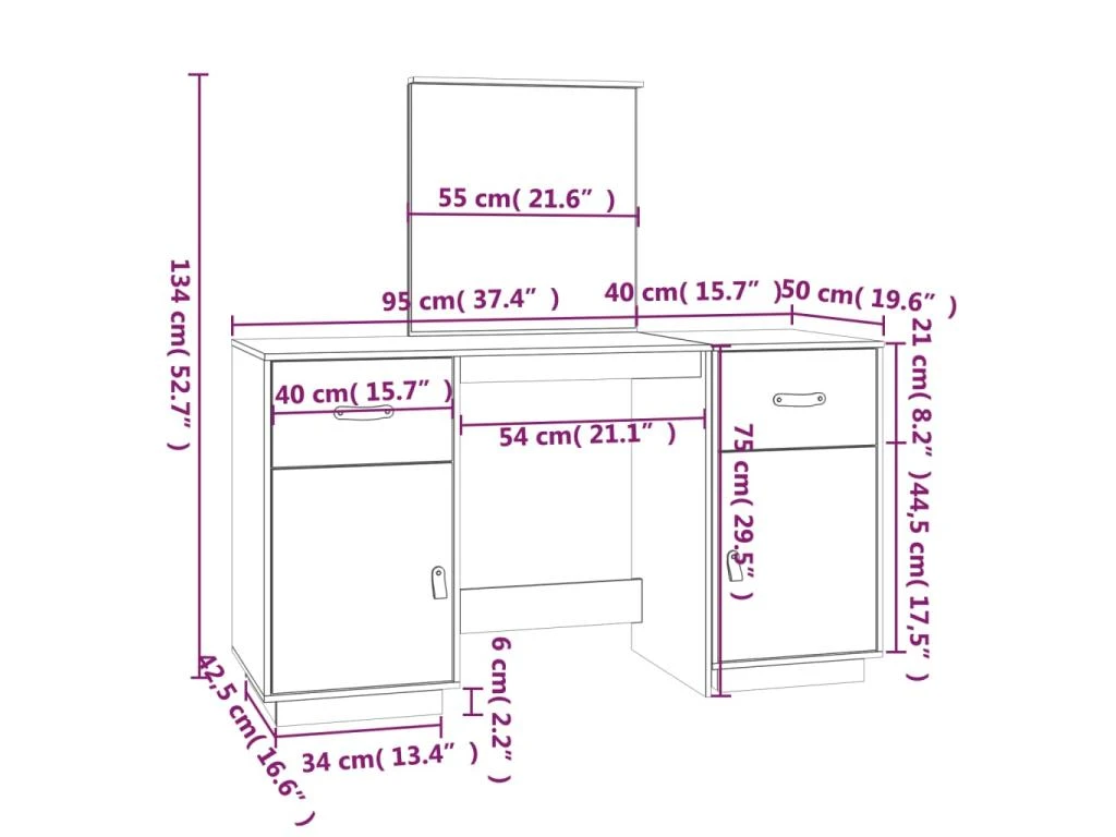 Dimensions de la coiffeuse : 95 x 50 x 134 cm (l x P x H)
