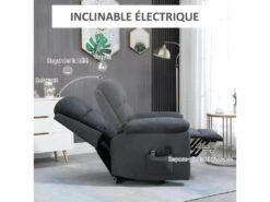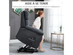 Caractéristiques : – Fauteuil de massage releveur 2 en 1 – Fonction massage intégrée : 8 différents points de massage, nombreux modes disponibles – Fauteuil grand confort de style contemporain coloris gris pour une parfaite intégration à votre intérieur – Équipé d’un dossier inclinable (jusqu’à 135°) et d’un repose-pieds relevable électriquement par télécommande – Fonction timer – Fonction releveur assurée par un vérin hydraulique – Fauteuil idéal pour les personnes âgées ou à mobilité réduite – Assise dotée d’un rembourrage mousse densité 24 Kg/m3 – Grande fléxibilité et souplesse grâce au système de ressort sous-jacent – Accoudoirs, appui-tête et dossier ergonomique pour un confort d’installation optimal – Poche latérale de rangement pour votre télécommande, vos journaux ou autres – Revêtement en tissu 100% polyester aspect lin très perméable à l’air et donc très agréable au toucher par n’importe quelle condition : chaleur ou fraicheur Spécifications : – Couleur : gris – Matériaux principaux : tissu 100% polyester aspect lin, garnissage mousse, acier – Dim. totales : 85L x 94,5P x 103H cm – Dim. position inclinée : 42L x 160P x 85H cm – Inclinaison maximale de 168° – Dim. assise : 42L x 53P x 48H cm (ép. : 15 cm) – Dim. dossier : 69L x 65H cm (ép. : 24 cm) – Longueur câble d’alimentation : 1,5 m – Puissance : 14,4 W / tension d’entrée : 220 V / 50Hz – Certifications normes CE-EMC, LVD, RoHs, ERP – Charge max. recommandée : 180 Kg – Livraison en 2 colis
