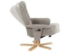 – Le revêtement du fauteuil et du repose-pieds est en tissu de coloris gris clair.