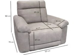 - DIMENSIONS APPROXIMATIVES : Largeur 107 cm x Hauteur 100 cm x Profondeur 95 cm / Hauteur d’assise 47 cm / hauteur dossier 65 cm / largeur accoudoir 30 cm / largeur assise 46 cm / profondeur assise 54 cm