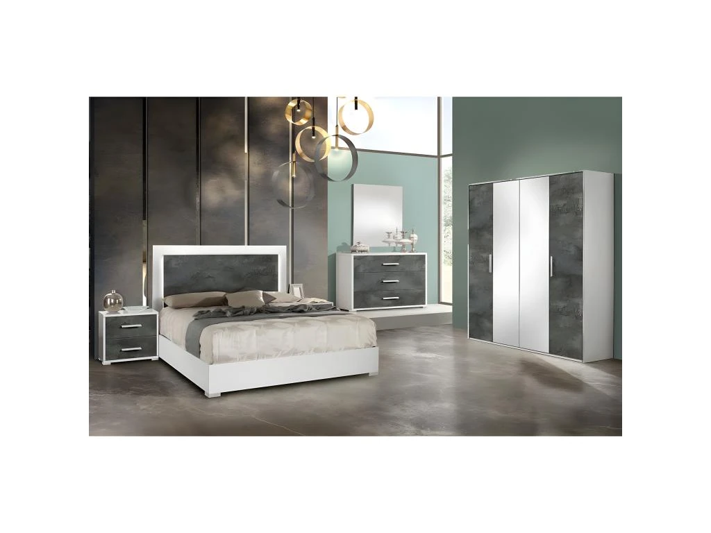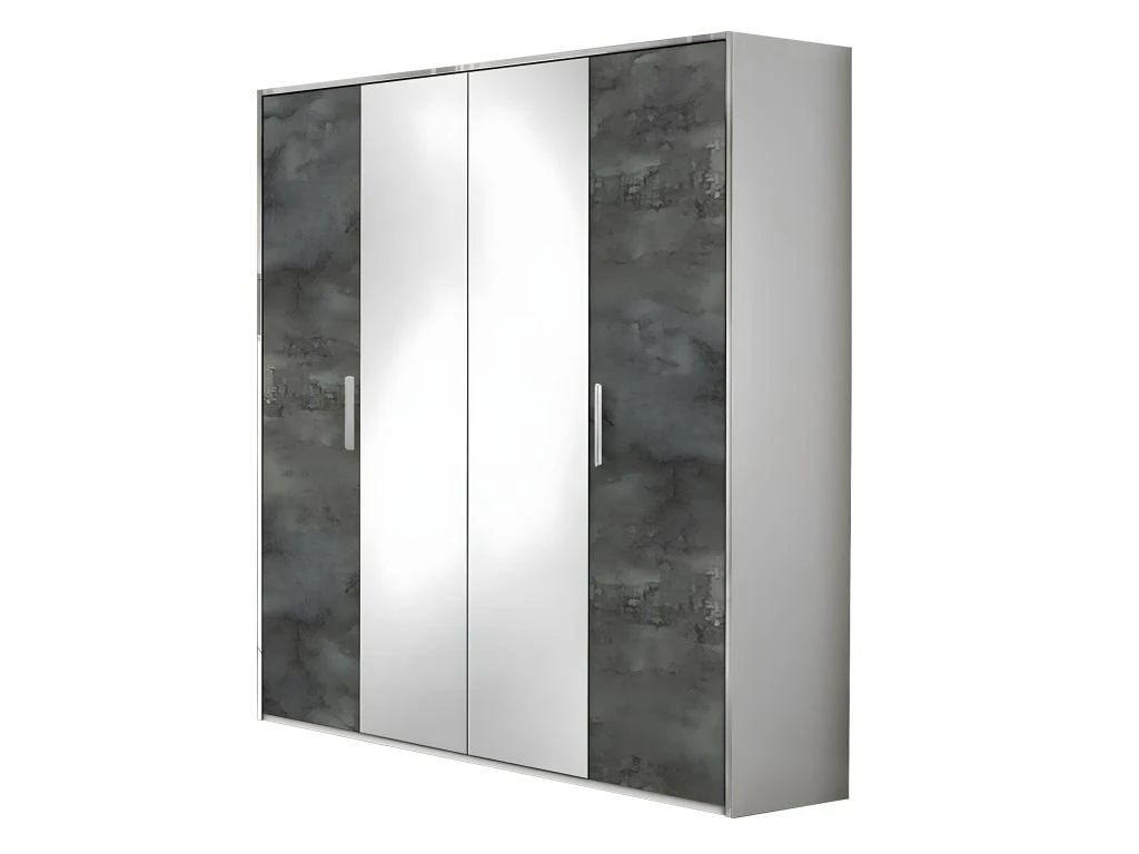 Structure en panneaux de particules ép. 18mm. Finition laqué brillant coloris blanc. Portes battantes façades aspect béton. Miroirs en façade. Intérieur : 1 penderie et 4 grandes étagÚres.