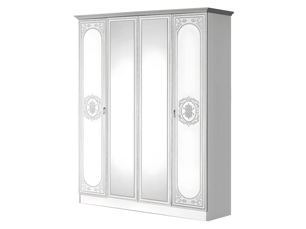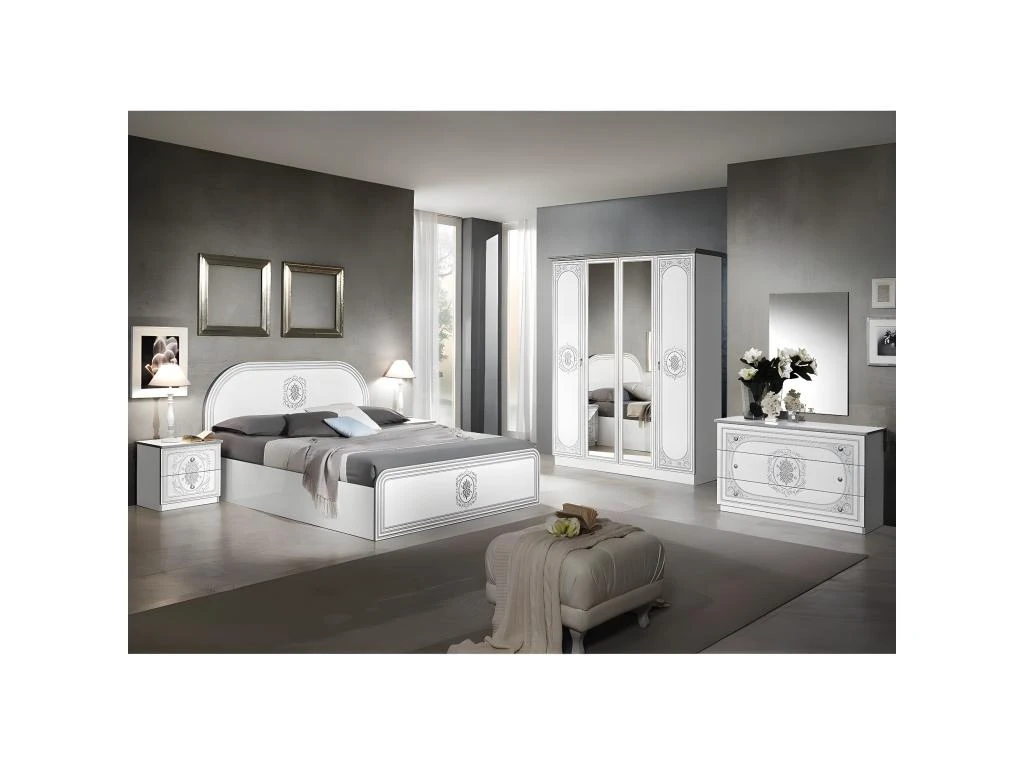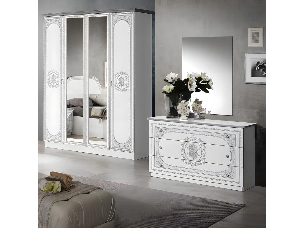 Structure en panneaux de particules Ep. 18mm, revĂȘtement en mĂ©laminĂ© blanc brillant. Champs et Corniche en mĂ©laminĂ© gris. 2 portes en panneaux de particules Ep. 18mm, revĂȘtement en mĂ©laminĂ© blanc, champs en mĂ©laminĂ© gris, motif arabesque sĂ©rigraphié argentĂ© et 2 portes miroirs. Dos en MDF. PoignĂ©es mĂ©talliques. CĂŽtĂ© droit : 3 tablettes de rangement. CĂŽtĂ© gauche : 1 tablette supĂ©rieure + 1 penderie.