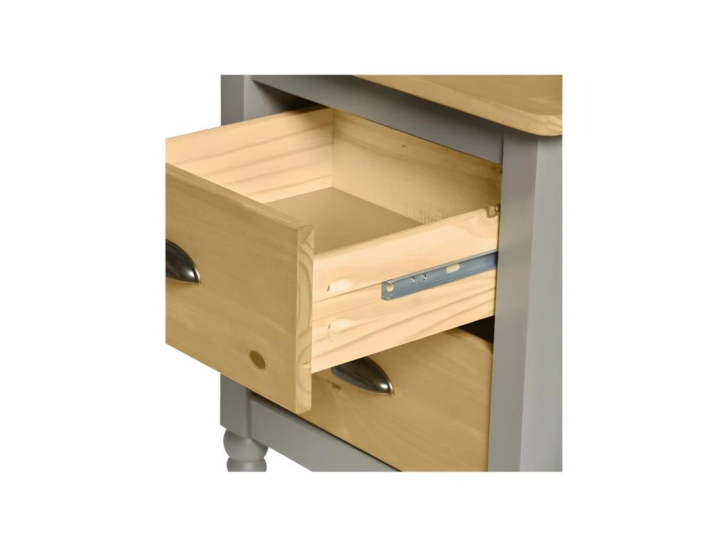 Corpus et piétement sont mis en lumière par une peinture grise qui met délicatement en valeur le plateau et les 2 tiroirs et leur bois teinte miel.