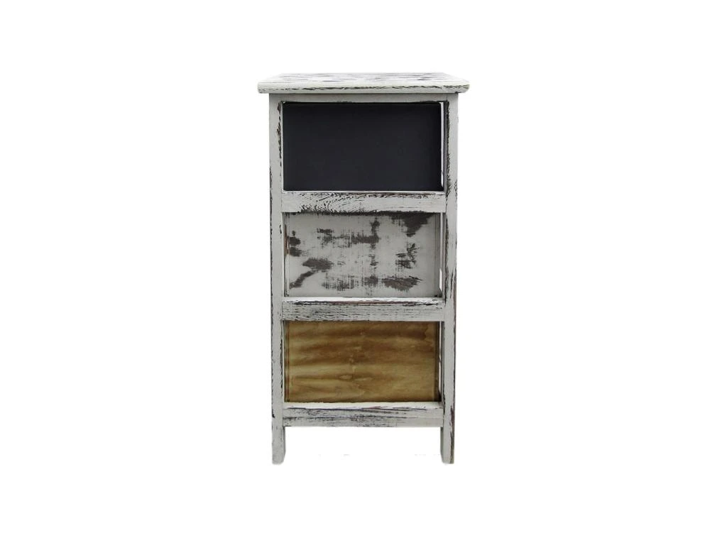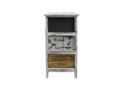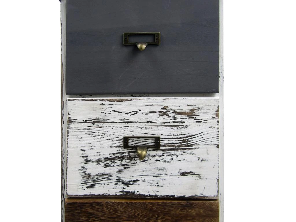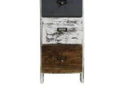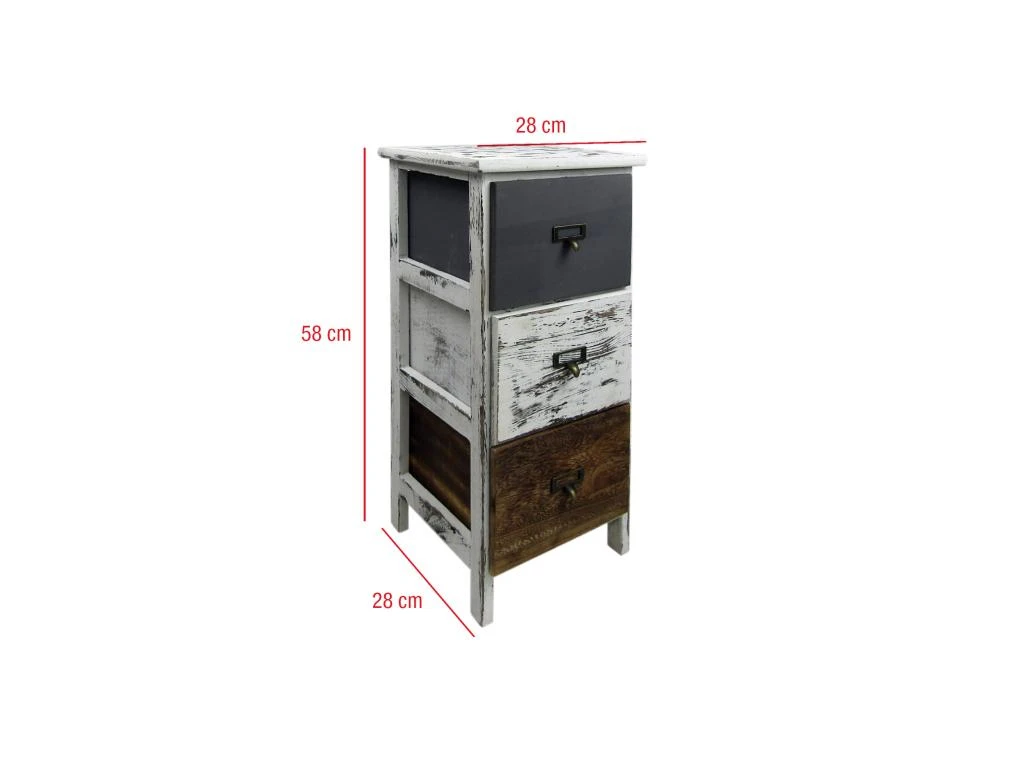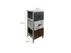 o Dimensions: H 58 cm x L 28 cm x P 28 cm o Dimensions des tiroirs (3): H 15 cm x L 21,5 cm x P 23 cm o Couleur: Blanc, Marron, Gris Shabby
