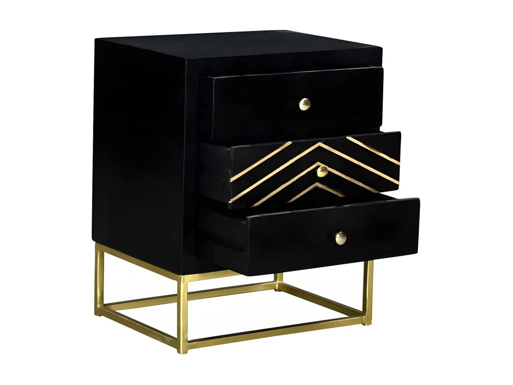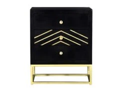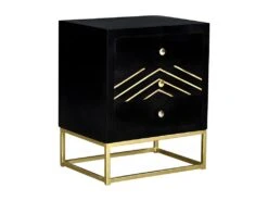 Chic et élégante, la collection PRISMIN apporte un peu de glamour à votre chambre ! Inspirée des meubles Art déco du début du siècle, elle mêle avec brio la noblesse du bois et le scintillant du métal doré ! Ses motifs géométriques dorés donneront une touche de pep’s à votre déco. En bois de manguier, la collection PRISMIN vous assure une robustesse dans le temps qui saura vous réjouir !