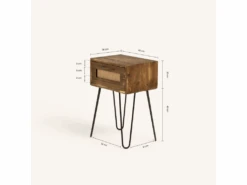La table de chevet industrielle Marnie est fabriquĂ©e Ă la main Ă partir de bois de sapin d’origine durable et d’un filet de raphia naturel sur les façades des tiroirs. Le raphia est une fibre vĂ©gĂ©tale obtenue Ă partir d’un palmier prĂ©sent dans certaines rĂ©gions d’Afrique et d’AmĂ©rique. Sa flexibilitĂ© et sa grande rĂ©sistance le rendent facilement rĂ©utilisable, ce qui fait du raphia une option très Ă©cologique.