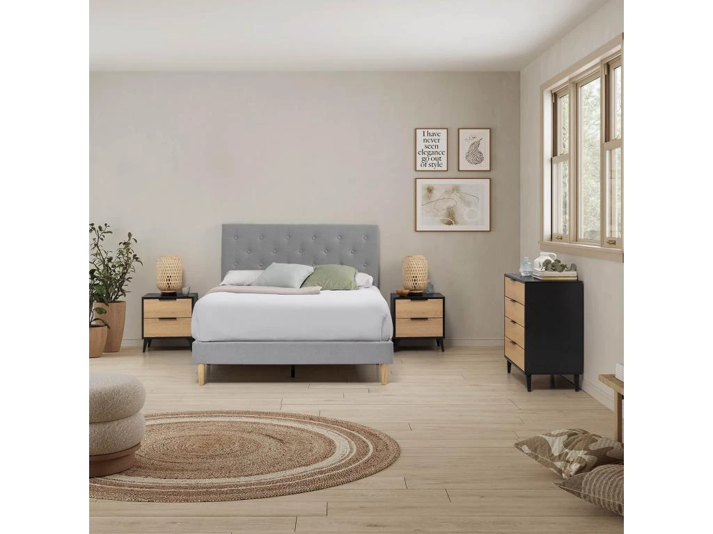 · Comme nous l’avons mentionnĂ©, la table de nuit Kalma est fabriquĂ©e en mĂ©lamine et possĂšde une finition dans laquelle on distingue clairement le motif de grains imitant le bois naturel. Les pieds sont relativement hauts, en PVC et de la mĂȘme couleur que la structure principale du meuble. La façade des tiroirs, quant Ă elle, est de couleur chĂȘne, tandis que les poignĂ©es allongĂ©es sont en aluminium.