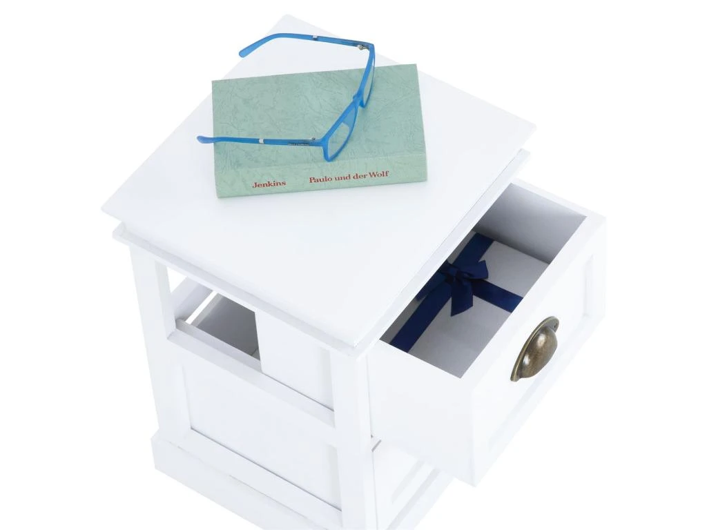 – La table de chevet est fabriquĂ©e en bois de paulownia lasurĂ© blanc mat.