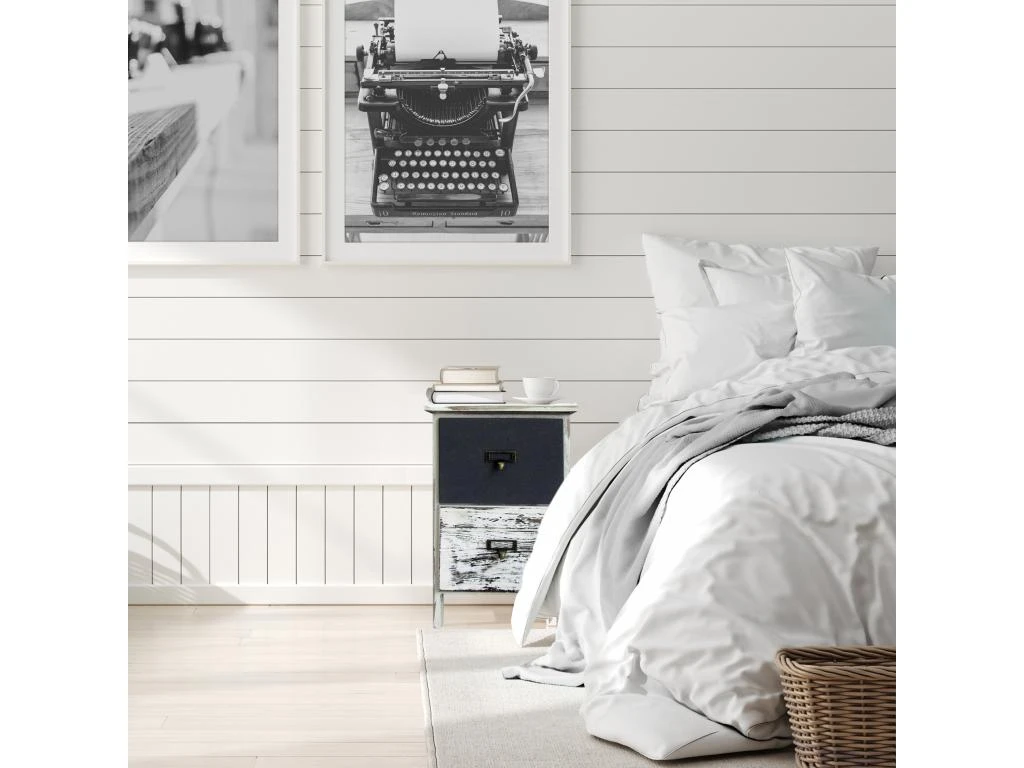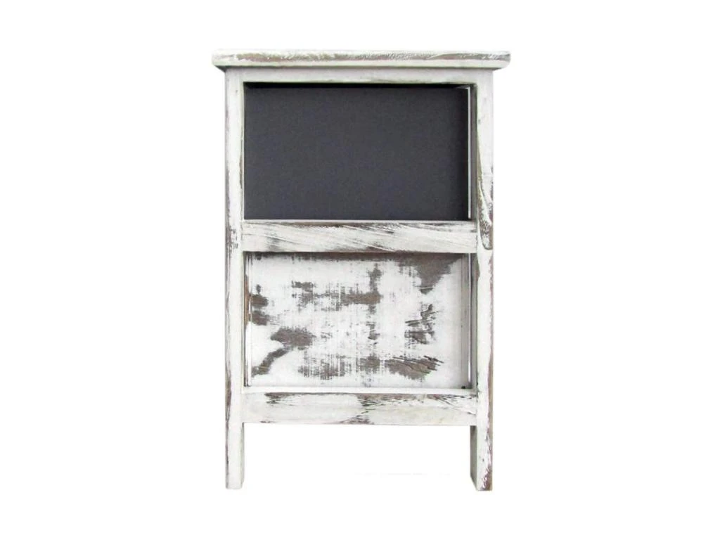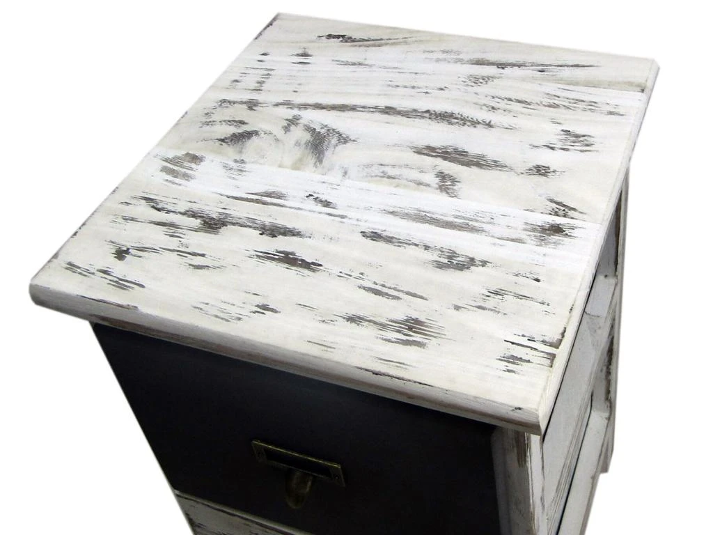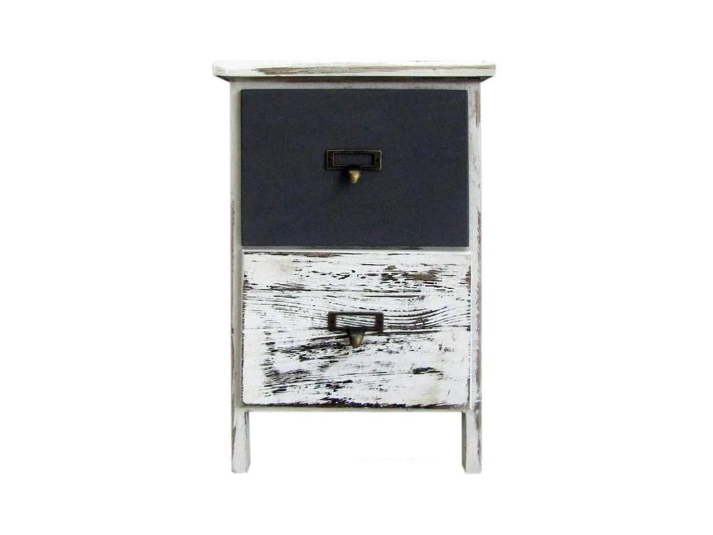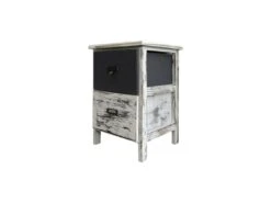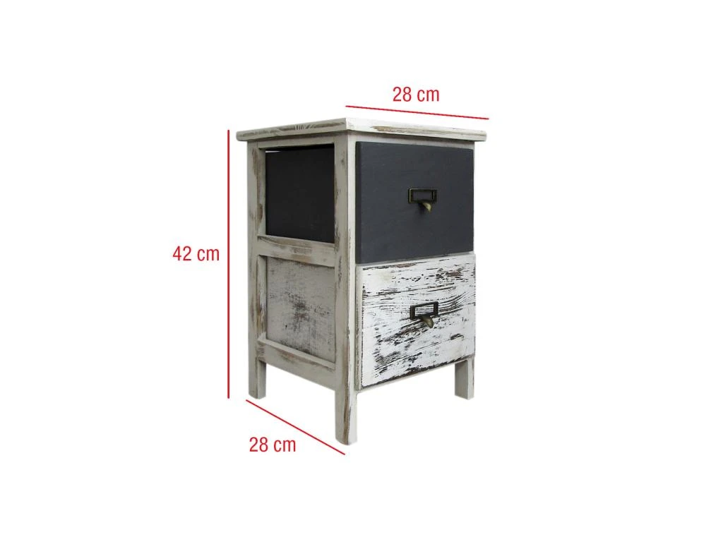 o Dimensions: H 42 cm x L 28 cm x P 28 cm o Dimensions du tiroir (2): H 15 cm x L 21,5 cm x P 23 cm o Couleur: Blanc, Gris shabby