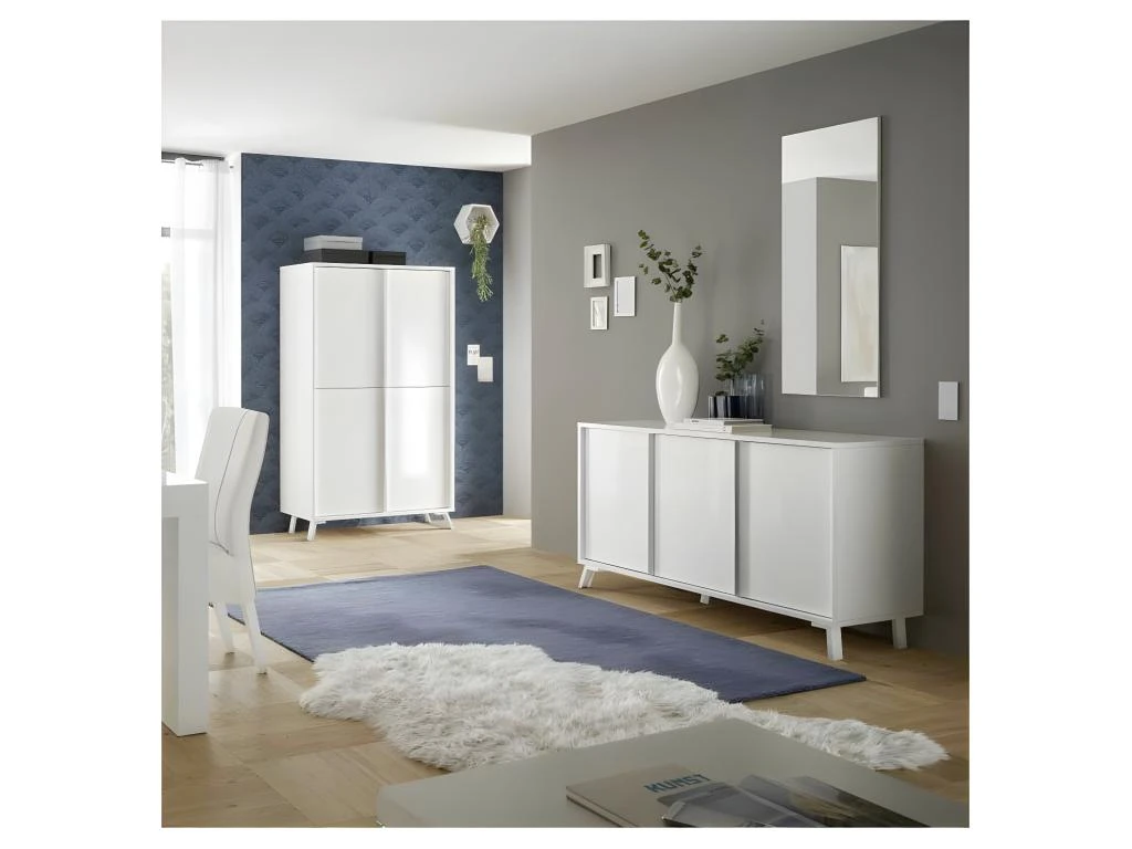 Design minimaliste et application d’une très belle laque multicouches Blanc brillant pour ce vaisselier 4 portes fabriquĂ© en Italie.
