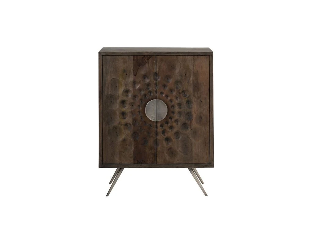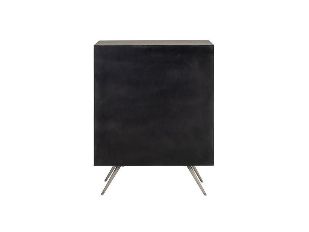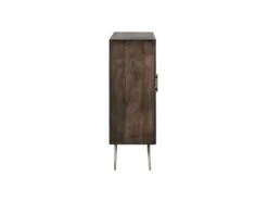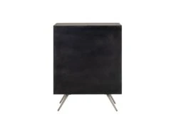 Solidement campé sur un piétement en métal lointainement inspiré du mobilier Scandinave et assorti aux poignées design japonisant, ce meuble de rangement est réalisé en bois de Manguier.